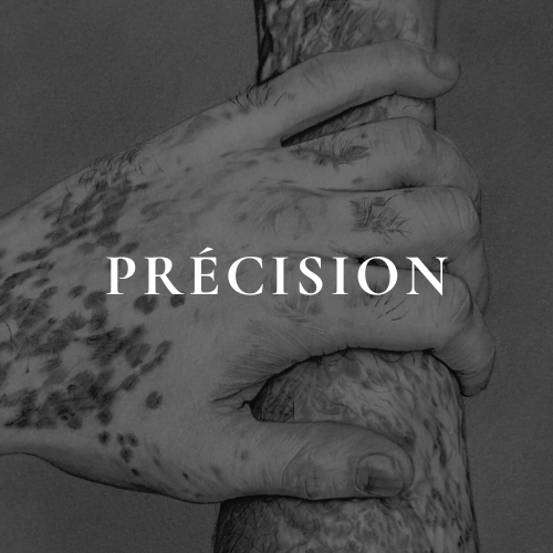 Ma pratique du dessin hyperréaliste est née à l’adolescence, guidée par une fascination pour le portrait en noir et blanc. Très tôt, j’ai cherché à représenter les marques discrètes du corps, dans une volonté de valoriser sa singularité et de questionner les normes imposées. C’était une démarche de bienveillance, tournée vers la réappropriation de soi.