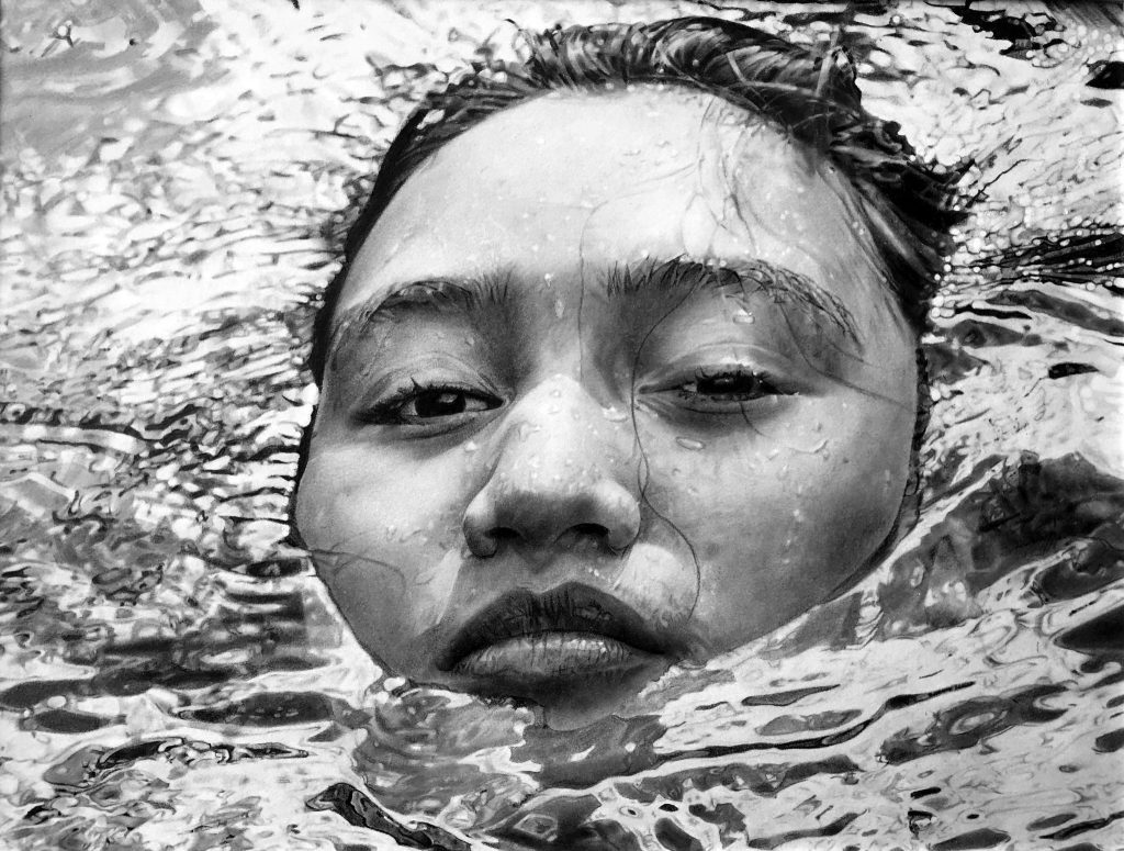 À mi-chemin entre deux mondes, son visage émerge, paisible, habité. Le regard, profond et silencieux, semble interroger autant qu’il accueille. Chaque goutte, chaque reflet sur la surface, devient un fragment de temps figé, précieux.